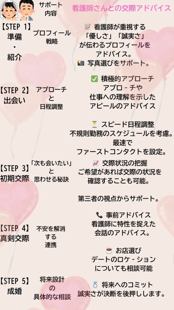 短期間にこれだけのサービスやサポートを受けることが看護師さんとの成婚率をあげる理由になります