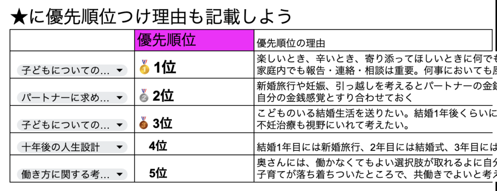 次に、理想と現実の差がわかったところで優先順位とその理由を記載します!