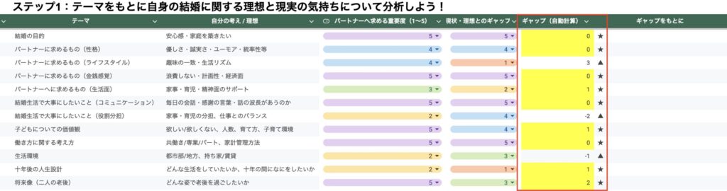 入力していくと、濃い黄色と★・▲マークにて理想とギャップが入力されているね