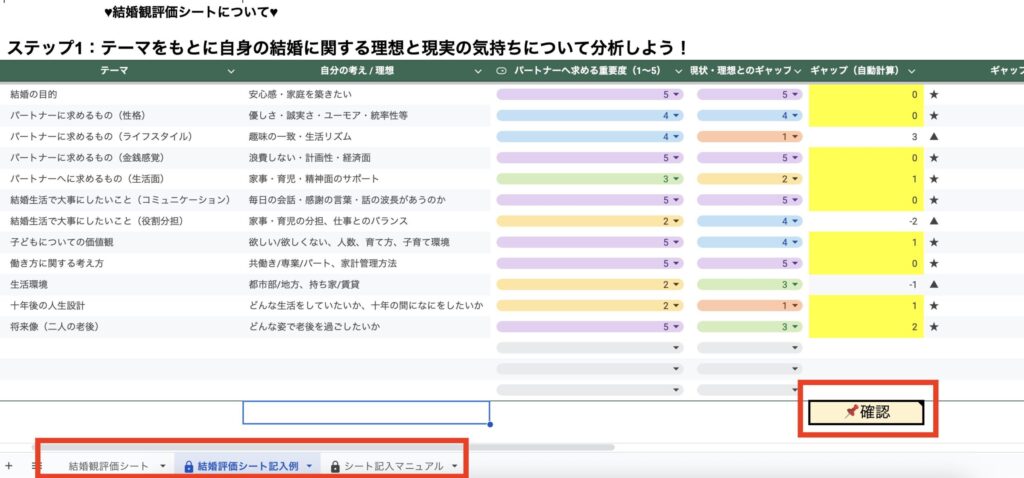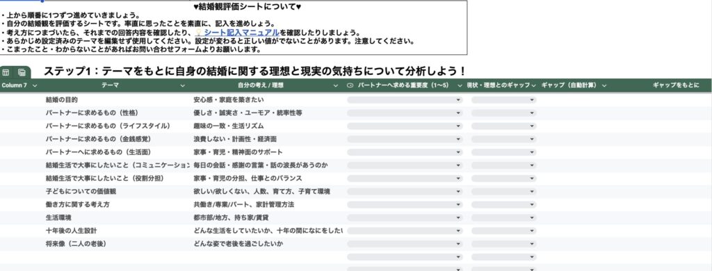 - こちらのスプレットシートを記入することで、「あなた自身の結婚観」を見つけることができます!