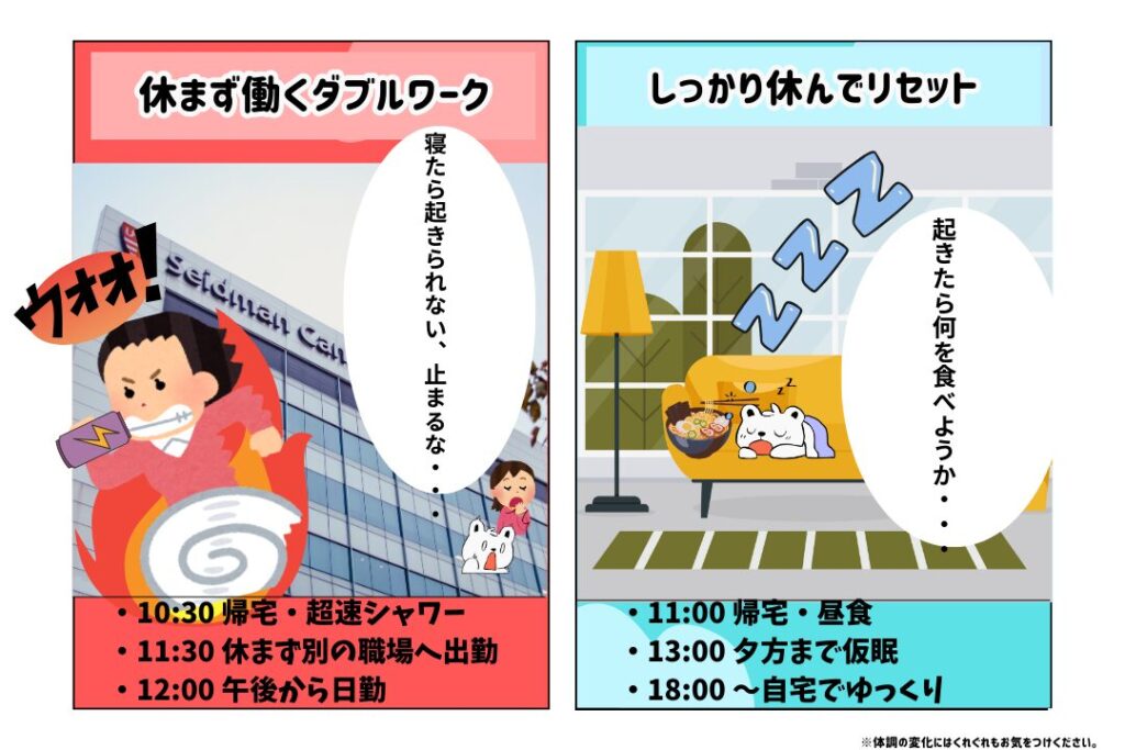 ※ 夜勤明けに別施設勤務と私生活を重ねると、翌日の回復が大きく遅れます